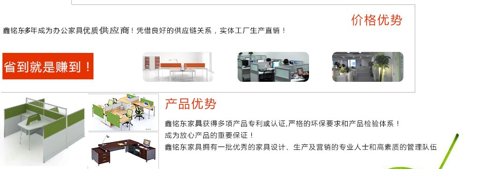 深圳市鑫銘東家具有限公司專業(yè)銷售各類辦公家具!產(chǎn)品涉及多種系列,如:班臺、班椅、屏風(fēng)、會議桌、會議椅、辦公沙發(fā)、茶幾、辦公桌、文件柜、電腦桌椅、各式餐臺、餐椅、書柜等辦公家具。 鑫銘東家具擁有一批優(yōu)秀的家具設(shè)計、生產(chǎn)及營銷的專業(yè)人士和高素質(zhì)的管理隊伍。銘東家具以"先難后易"之戰(zhàn)略,在產(chǎn)品結(jié)構(gòu)、產(chǎn)品質(zhì)量及服務(wù)水平方面,均推陳出新,力求完善,精益求精。使我們的產(chǎn)品質(zhì)量保持在國內(nèi)外家具潮流的先進(jìn)水平,力求滿足客戶的特殊需求。鑫銘東家具多年來致力于環(huán)保、實用家具的設(shè)計與開發(fā),集生產(chǎn)、銷售、服務(wù)于一體。本著"以人為本"的設(shè)計理念,大量開發(fā)符合人體工程學(xué)的各種產(chǎn)品,以"誠信為本"的質(zhì)量方針,真材實料,認(rèn)認(rèn)真真做產(chǎn)品,實實在在做人。鑫銘東家具更致力于創(chuàng)造"零維修率"的制造境界,實現(xiàn)"沒有維修的服務(wù)才是最好服務(wù)"的口號》了解更多